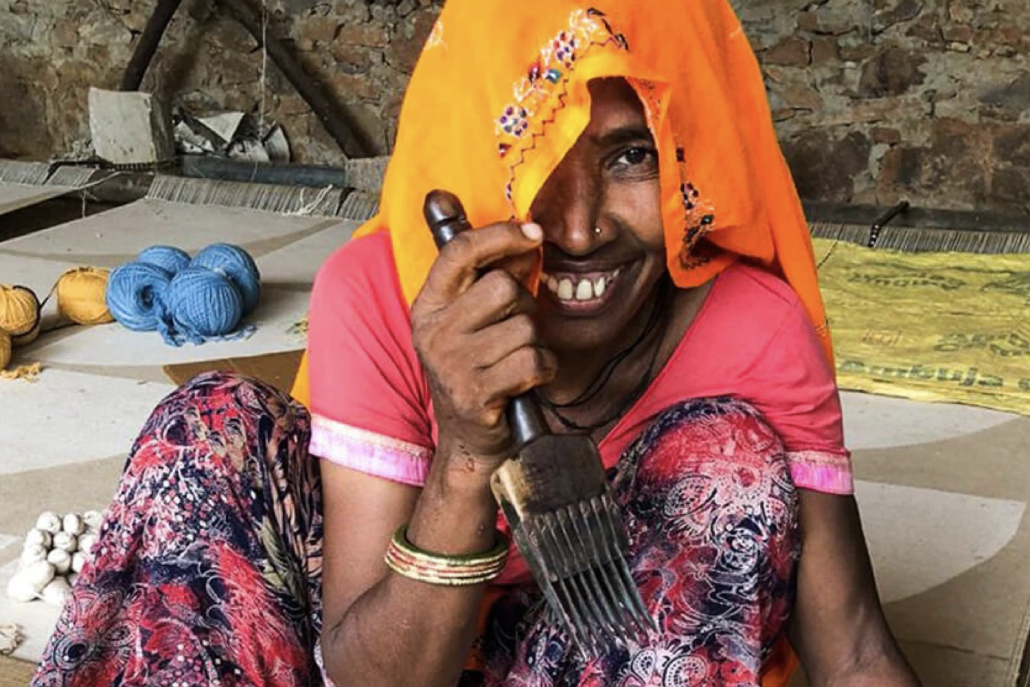 The group creates incredibly detailed, handwoven cotton rugs, and what makes theirs so special is how they’re woven – on the ground, placed so that the weaver sits on top of the rug in order to see what they’re creating. The result is a tight, intricate weave, one that can achieve shapes and curves where other techniques fall short. All of the cotton is dyed and spun in house, too, allowing for a beautiful array of colors and precision.