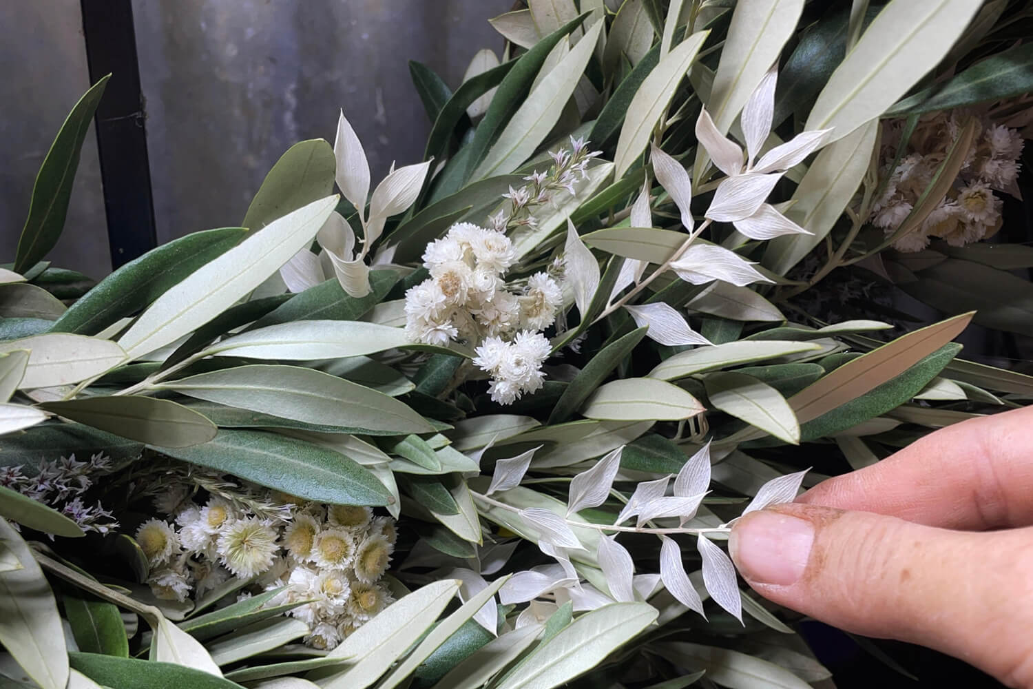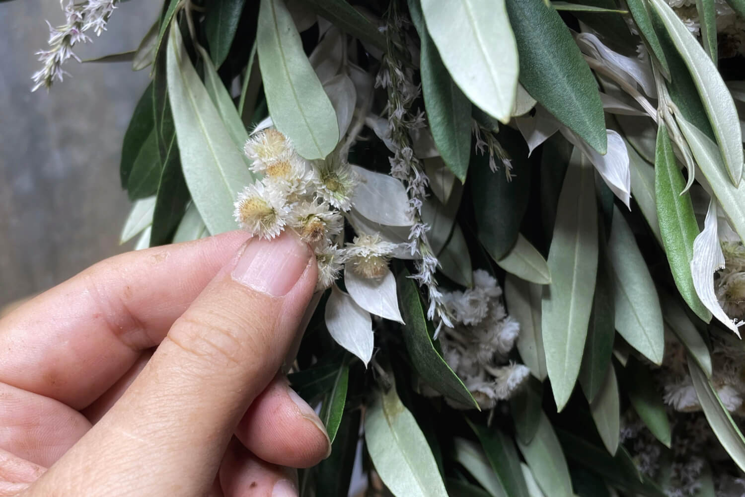 Crafted with locally-sourced and foraged flowers, every piece invites the viewer to get lost in natural beauty, imagining the place where they come from. Partnering with small, often women-owned farms, Nina looks for botanicals farmed with organic, low-till methods. Passionate about every petal, Nina will even travel to wine country to forage for grapevines or go trekking through the Sierra Nevadas to find the perfect pine cone.