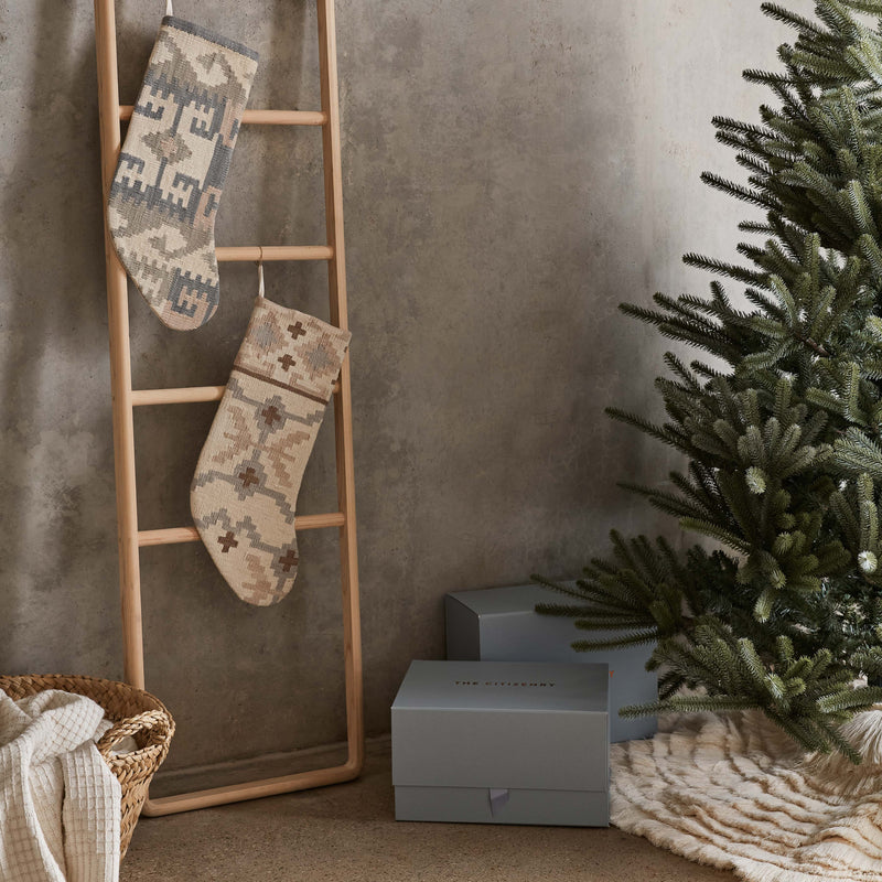 Inspired by the lovely, lived-in look of a vintage rug, this timeless kilim stocking is a modern holiday heirloom. Woven with a traditional slit weave technique, the pattern of each piece has small, unique ‘breaks’ that add to its beauty. Whether placed over your entryway or mantel, we recommend stuffing them with presents.
