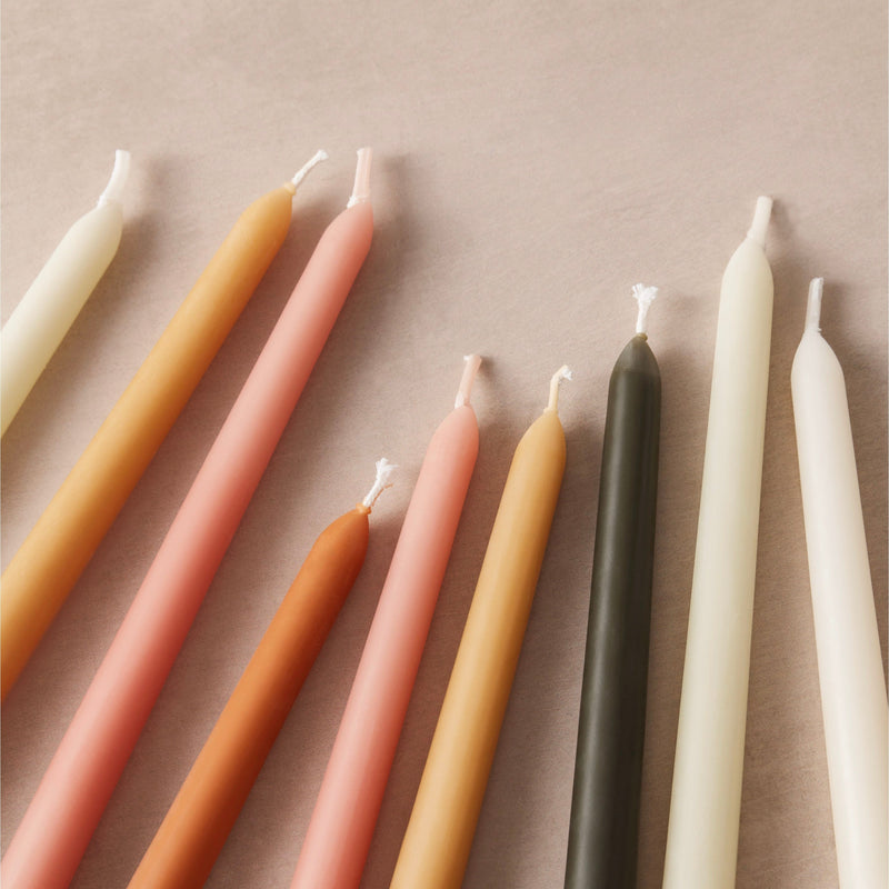 A bright spot in any space, these handmade taper candles are crafted from pure beeswax. Available in a range of rich, soothing colors, each 12” candle has a burn time of about 10 hours. Style as a rich set on your holiday table or over the fireplace.