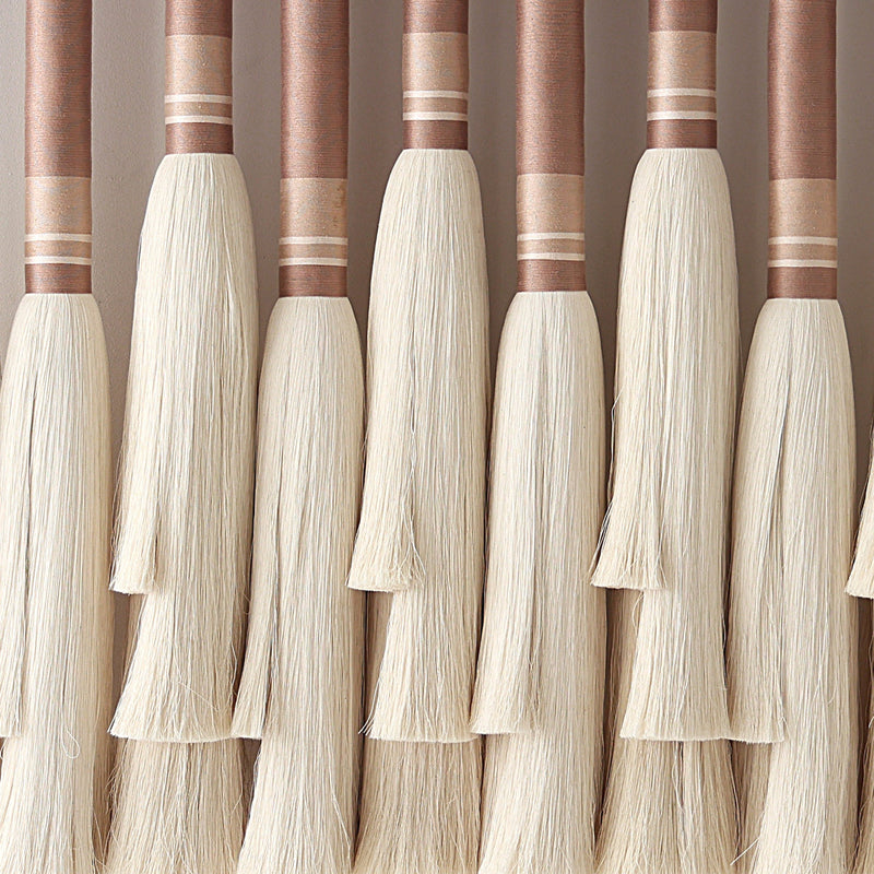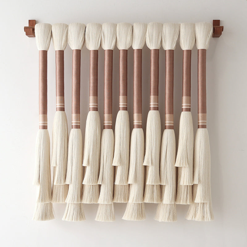 Natural raw cotton wrapped in muted clay tones, this wall hanging brings a sense of grounded beauty to any space. Each cascading layer is delicately trimmed to create sculptural depth and gentle movement. Finished with a rich Jequitiba wood rod sustainably sourced from Peru.