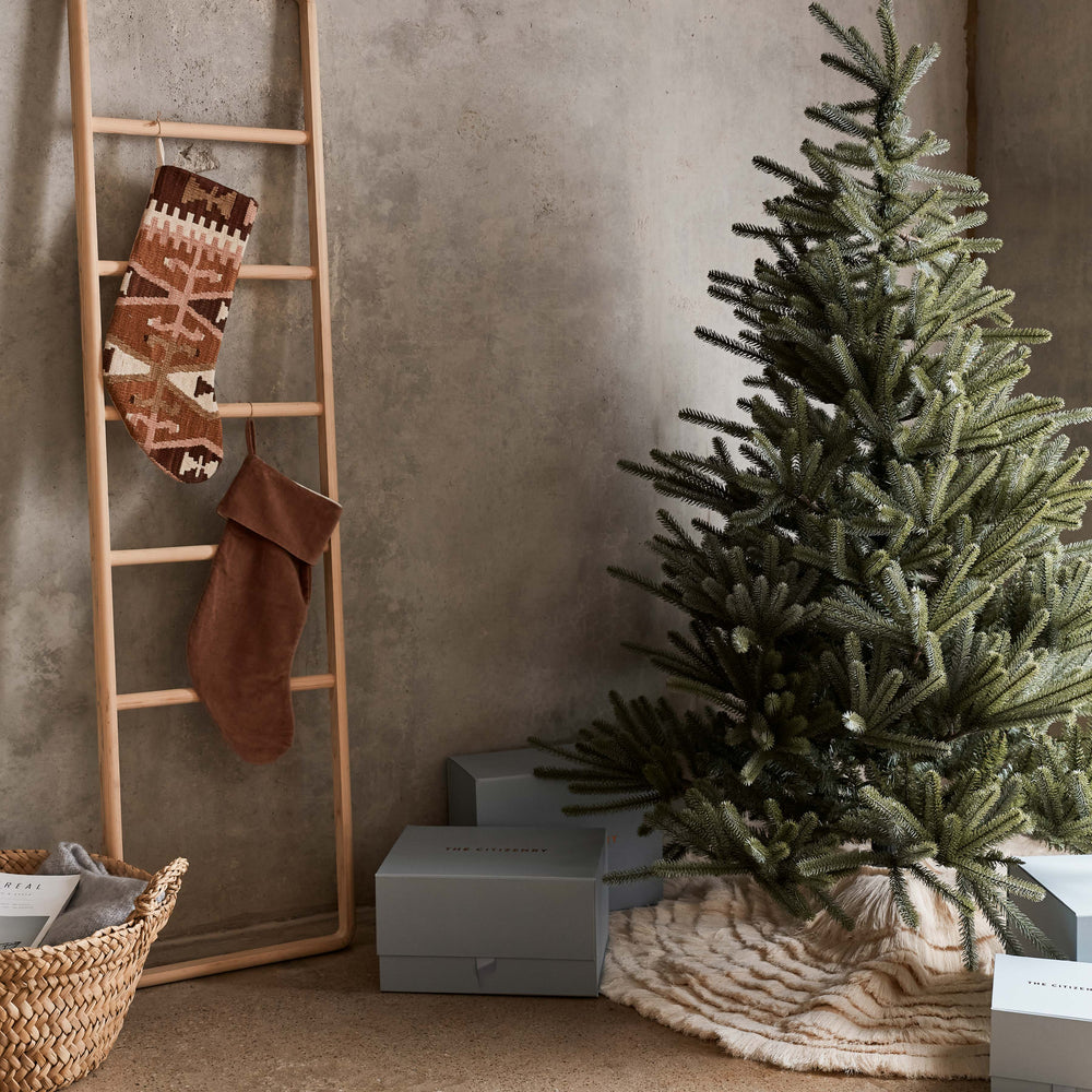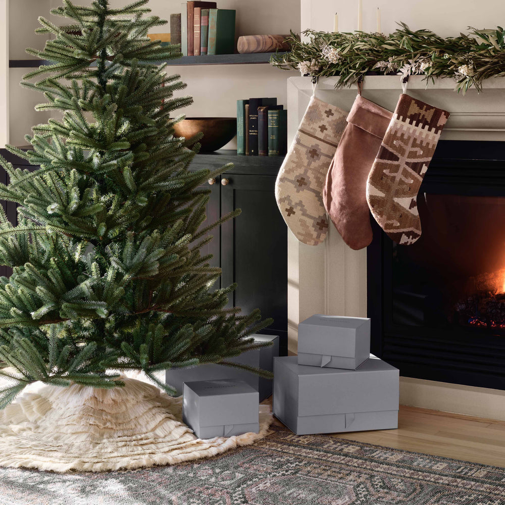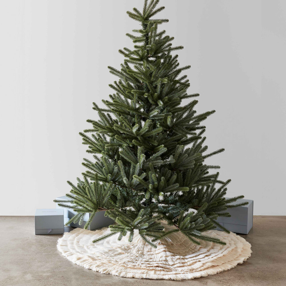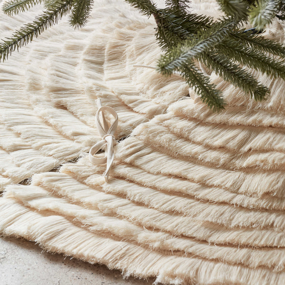 As beautiful as a bed of freshly fallen snow, this one-of-a-kind tree skirt uses rich textures and multiple layers to create a little holiday magic. Sustainably crafted from upcycled pieces of raw cotton, each piece reduces waste and upgrades your space at the same time.