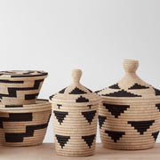 With their intricate traditional design, this handwoven basket is both remarkably durable and stylish. The mix of materials, graphic pattern, and stark palette add a stunning statement to any room.