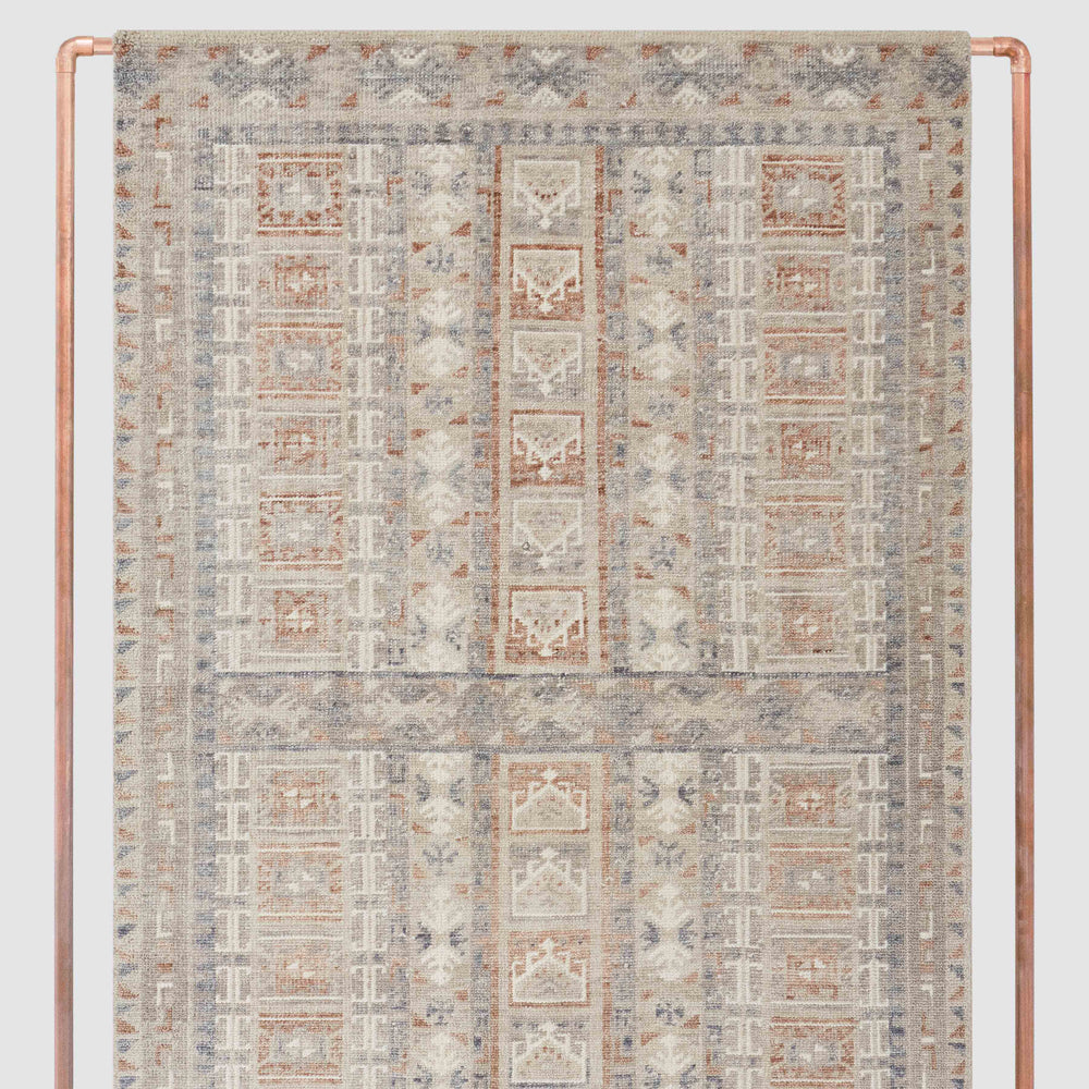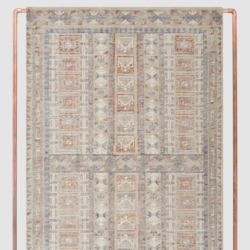 Read between the bold lines of this stunning hand-knotted area rug to discover a world of intricate motifs, painted in rich golden hues, warm flax gray, and splashes of Aegean blue. A large horizontal stripe runs through the center to add visual interest, along with unique color variations that add an heirloom-quality finish to every piece. Perfect for a living room or another high-traffic area of your home, its laid-back, lived-in charm is sure to make an impression.