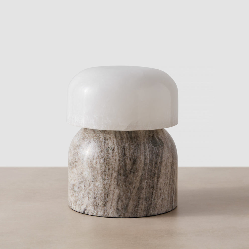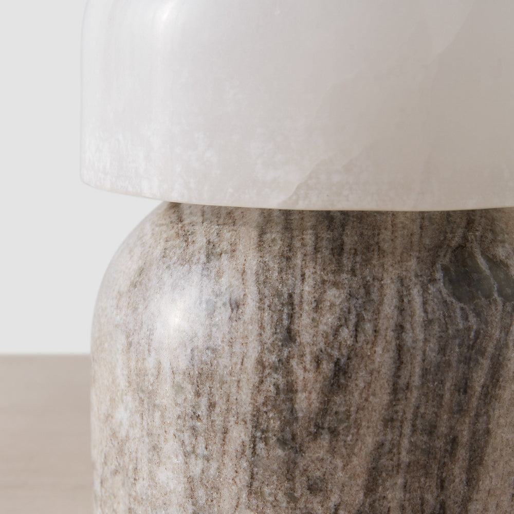 Two stones. One bright future. A glowing addition to any room of your home, this sculptural lamp mixes a richly-grained marble base with a cover carved from smooth alabaster. Whenever you need a touch of light, just flip the switch to add a radiant warmth to any space. Style this petite lamp next to other decor for a multi-layered look.